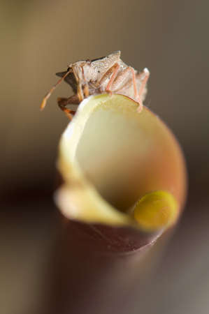 Green stink bug close-up on a brown flower leaf. Concept of insects in the natural environment