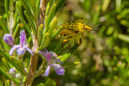 Yellow and black shield bug (pentatomidae) on a rosemary plant with lilac flowers, in Mangualde, Portugal