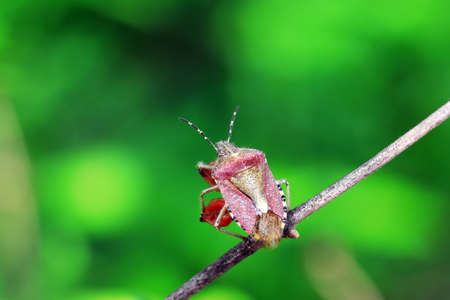 Natural closeup of a colorful red adult sloe bug or hairy shieldbug , Dolycoris baccarum sitting on green leaf