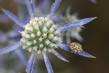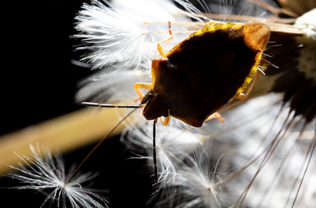 Yellow shield bug on fluffy flower close-up. Blurred green background.