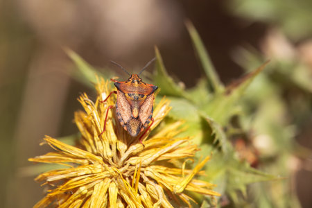 Close-up of Carpocoris mediterraneus, an insect of the Pentatomidae family, perched on a yellow milkweed flower