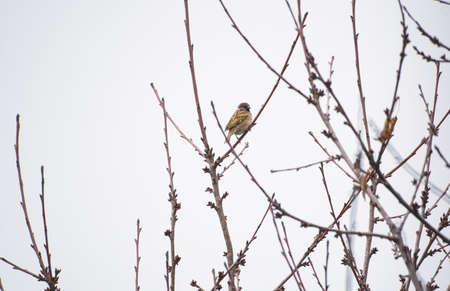 A sparrow on branches covered with snow and hoarfrost against the backdrop of a clear February sky.