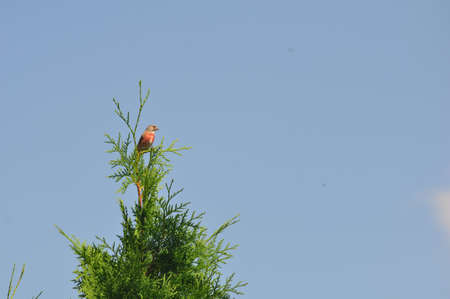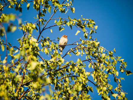 Male common rosefinch (Carpodacus erythrinus) perched in a birch in summer.