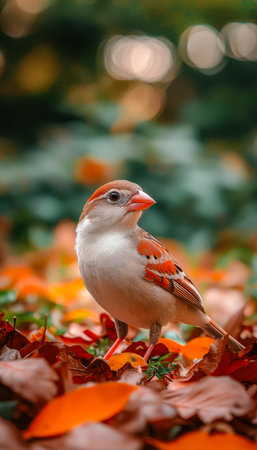 A tiny passerine perches delicately on vibrant autumn foliage, set against a soft, multicolored backdrop evoking serenity and seasonal change.