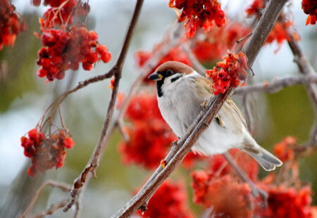 Pine grosbeak (Pinicola enucleator) is typical bird of North taiga, as well as typical invasive species (nomadic migration, breeds and winters where many seeds of conifers and ash berries). Female