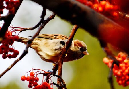 Pine grosbeak (Pinicola enucleator) female feeding on rowan berries in fall.