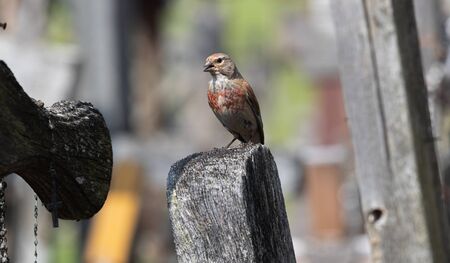 The bird sits on the cross on the hill of crosses. Hill of Crosses is a unique monument of history and religious folk art in Siauliai, Lithuania.