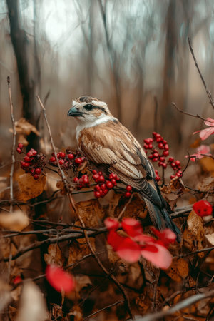 A bird with a pink and blue feather sitting on top of some red leaves, AI