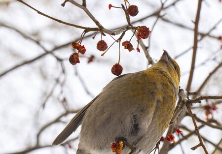 Pine Grosbeak male Eating Red Berries in Winter. Male Pine grosbeak, Pinicola enucleator, sitting on the tree branch and eats wild apple berries in winter season