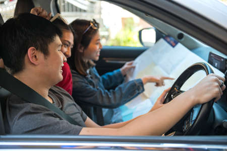Happy Asian young friends check map in car for road trip plan during driving. Holiday maker or travel vacation in summer concept.