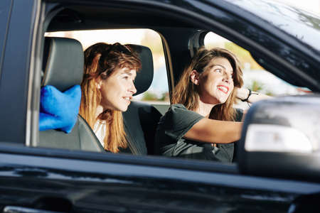 Cheerful female friends enjoying car ride and good talk on Sunday