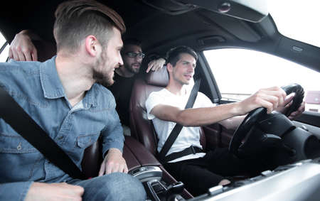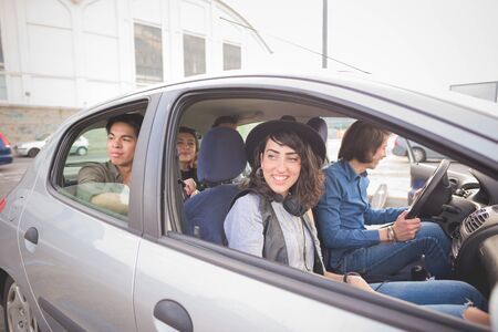 Group of young multiethnic friends sitting in a car, travelling all together, talking to each other, having fun - friendship, relax concept