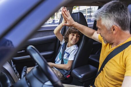 Father and son in protective masks driving car, Happy traveler family. Bonding Travel, Summer, Holidays, Journey, Trip concept.