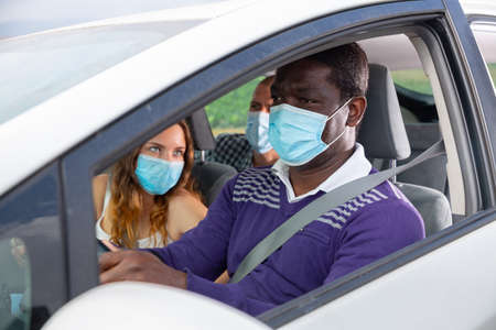 Carpool Ride Share. Friends Enjoy Taxi In Face Mask
