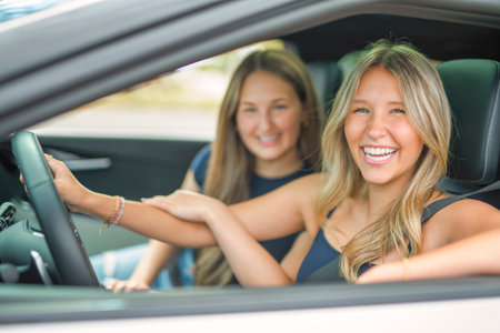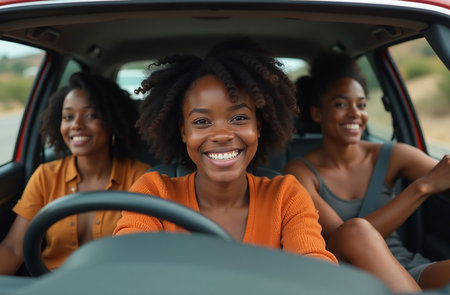 Woman smiling while driving a car with a female friend in the passenger seat. The driver is focused on the road, and the passenger is out of focus, smiling and holding a phone