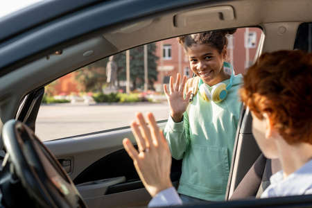 Smiling schoolgirl waving hand to her mom while getting out of car before going to school