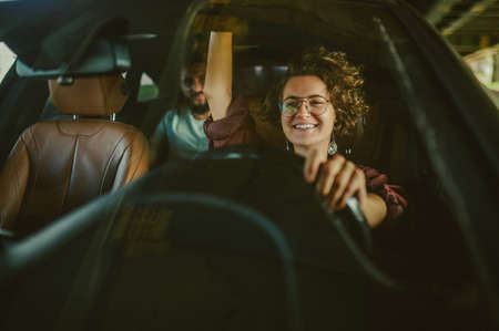 Young smiling caucasian woman and blurred man looking at camera from car window