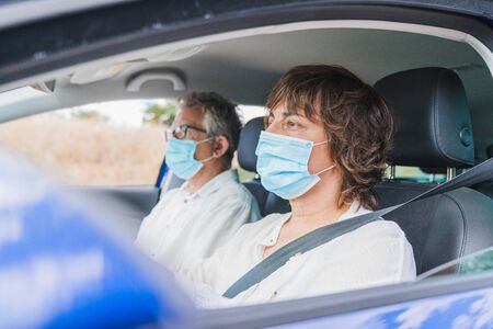 New normal. Female driver with a medical face mask driving a car with a passenger. Health protection. Family in the car protected by a mask safety and pandemic concept. Coronavirus. Social distance.