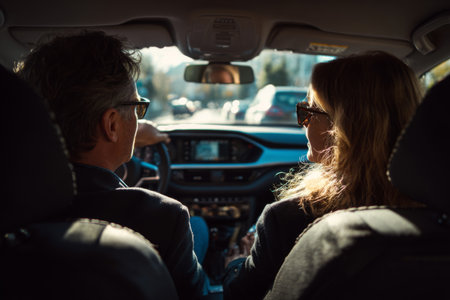 Two people sit in a car, enjoying a drive through a busy city street. Sunlight streams in, creating a warm and relaxed atmosphere. They share smiles and conversation.