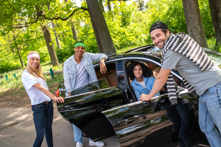 Generative AI : Group of friends having fun at car trip Four caucasian people on a sportive car with hands up