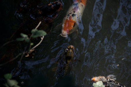 JapJapan koi fish or Fancy Carp swimming in a black pond fish pond. Popular pets for relaxation and feng shui meaning. Popular pets among people. Asians love to raise it for good fortune.an koi fish or Fancy Carp swimming in a black pond fish pond. High quality photo