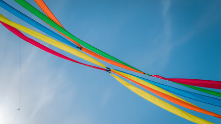 Multi-colored strips of tapes on a wind in the sunny summer day