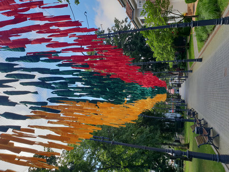 Colorful fabric decorations in vibrant hues of red, green, and yellow hang above a serene pathway lined with benches and lush greenery, creating a festive atmosphere