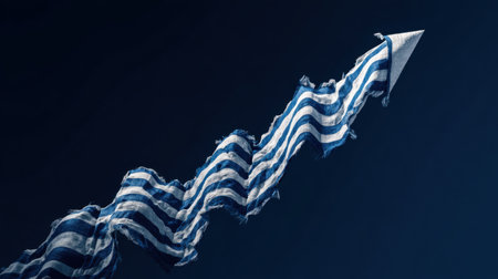 A stunning display of blue and white striped fabric creates an arrow-like shape, soaring against a dark background, symbolizing movement and freedom.