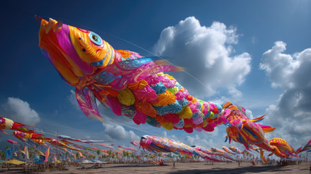 This captivating image showcases vibrant giant kites resembling fish, gracefully soaring in a blue sky, embodying the spirit of creativity and tradition at an outdoor festival.