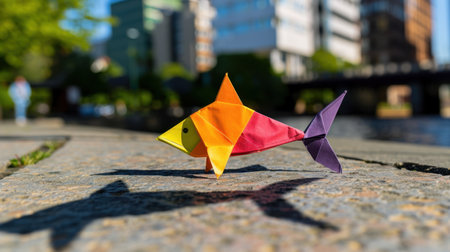 A vibrant origami fish sculpture made of colorful paper, beautifully set on an urban pathway, showcasing creativity against a blurred city backdrop with natural elements.