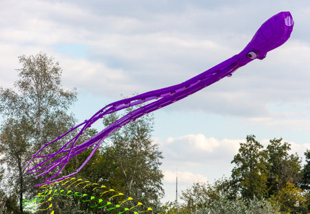 A squid kite flies in the sky.