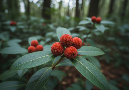 Vibrant red, textured, spherical berries clustered on a shrub with dark green, glossy leaves, captured in a detailed close up within a dense, shaded forest environment.