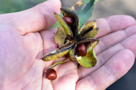 Red brown Peony seeds in a basket in the palm of your hand