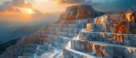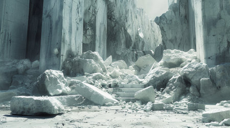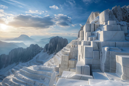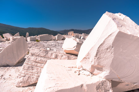 Panoramic view of a marble quarry with polished white stone blocks scattered across the ground, glistening under the sun.