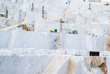 Bulldozers at work in a quarry of white marble