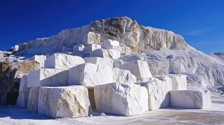 Natural white marble quarry under clear blue sky in bright sunlight.