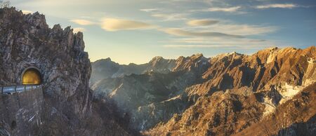 Alpi Apuane mountain road pass and tunnel view at sunset. Movie location in Carrara, Tuscany, Italy. Europe.