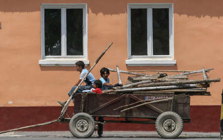 Vulcan, Romania, July 4, 2009: Children in a cart with wooden stakes in front of a house in Vulcan, Romania.