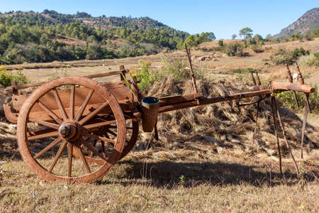 A beautiful old wooden wagon with two wheels on a rural farm field between Kalaw and Inle Lake, shan state, Myanmar