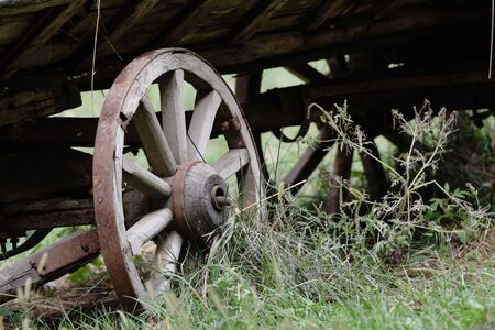 Rusty wagon wheels against a wooden cart, with grass. Useful for rustic backgrounds