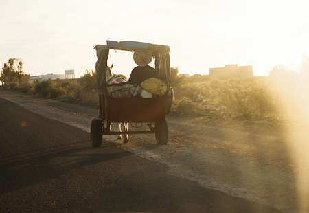 Man riding in a carriage, drawn by hourse, local streets and poverty