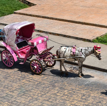 Malang, Indonesia -11 April, 2021: A horse drawn carriage with complete accessories is standing in front of the Batu city square with a wagon tied behind it