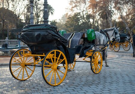 Seville, Spain - May 10, 2018: Series of horse-drawn carriages, with yellow wheels, awaiting tourists in Seville