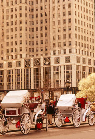New York, USA - June 6, 2019: Horse carriages waiting for customers at the central park in New York City