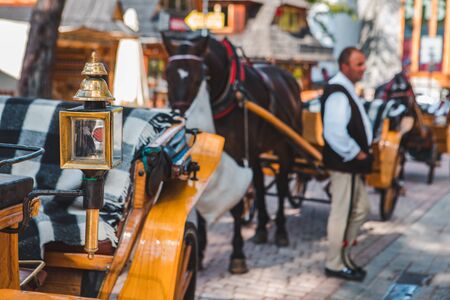 Two beautiful brown horses in the streets of Lviv, Ukraine. Tourist carriage waiting for passengers on the streets in historic city center.