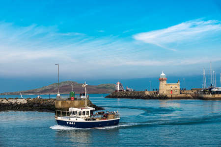 Howth, Ireland - January 1, 2020: Lighthouse and Ireland Eye with fishing ships sailing and people around in the small trading port of Howth, fishing village near Dublin, Ireland