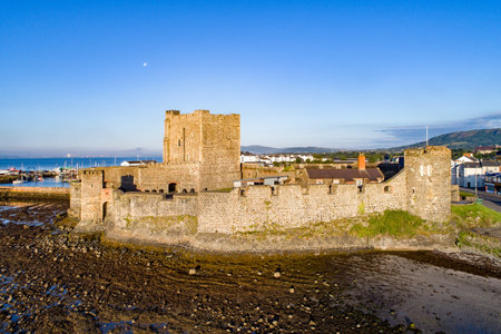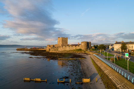 Medieval Norman Castle in Carrickfergus near Belfast, Northern Ireland. Aerial view at sunrise with far view of Belfast in the background.