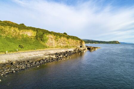 Causeway Costal Route with Black Arc tunnel. Scenic road along eastern coast of County Antrim, Northern Ireland, UK. Aerial view in sunrise light