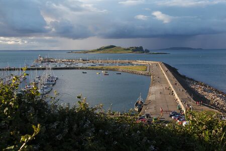 Breakwater with people around in the small trading port of Howth, fishing village near Dublin, Ireland