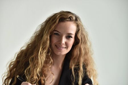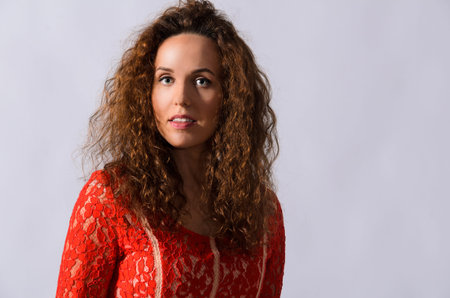 portrait of beautiful caucasian woman with curly hair at studio